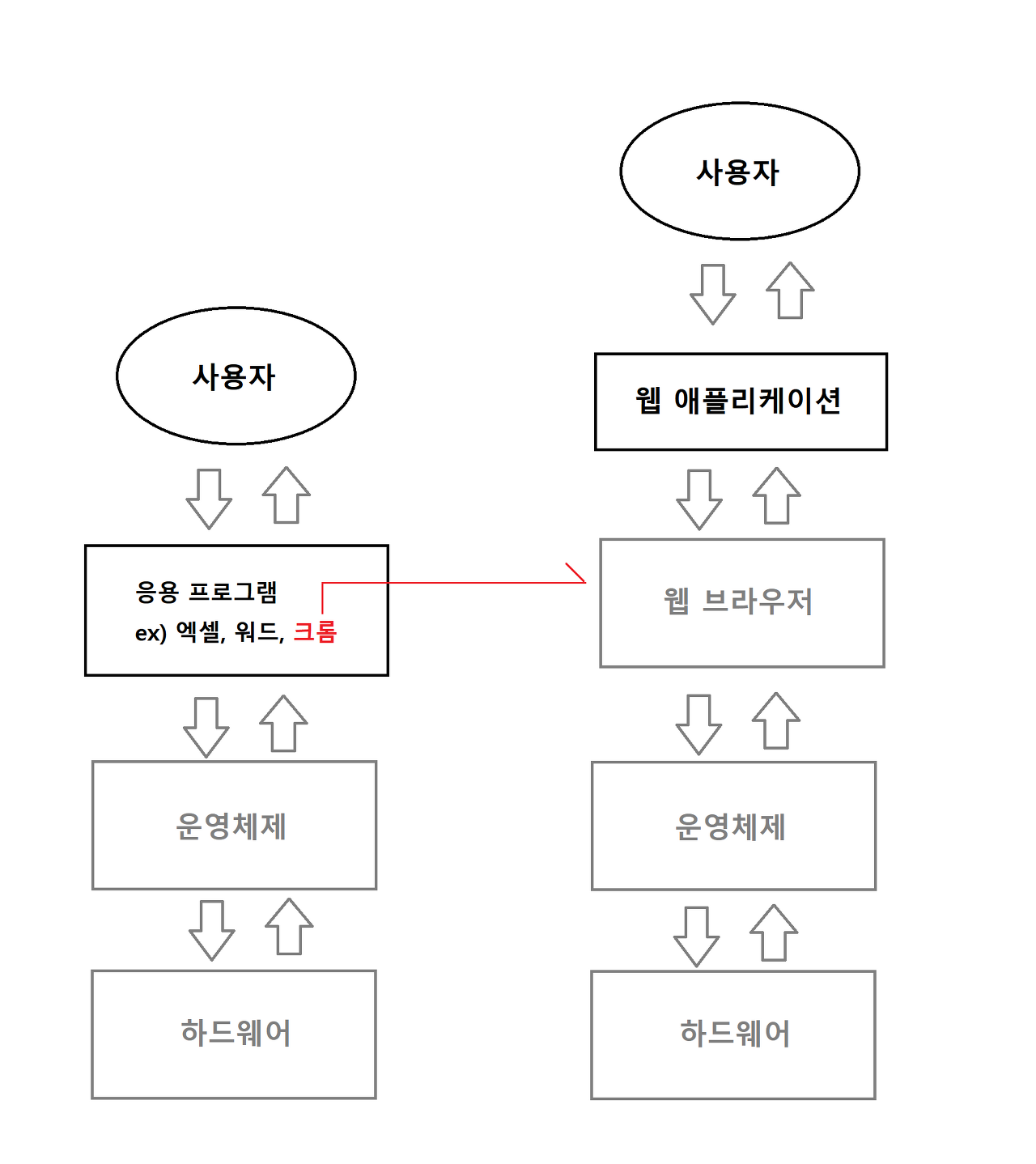 소프트웨어를 브라우저에서 이용할 수 있다는 것은 기존의 응용 소프트웨어 혹은 프로그램이라고 불리는 것들을 생각해보면 이해하기 쉽다. 이러한 것들은 하드 디스크에 설치해서 실행했다. 즉, 운영체제 위에서 작동했다. 그러나 웹 애플리케이션은 이보다 한 층 더 올라가 브라우저 위에서 이용할 수 있는 소프트웨어이다. 그리고 프로그램은 사용자의 입력을 받아 설계된 명령어에 따른 결과를 반환한다. 그래서 웹 애플리케이션은 사용자와 '상호작용'하며 브라우저에서 이용가능한 프로그램이다.