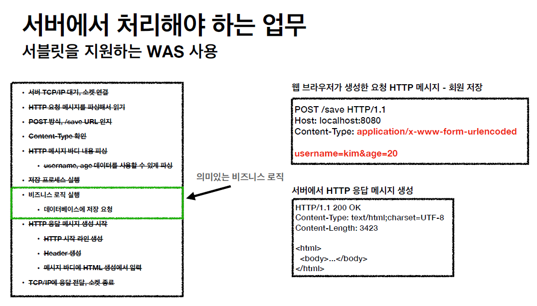 만약 서블릿을 사용하지 않는다면 개발자는 요청 메세지를 컴퓨터가 해석할 수 있도록 파싱 하고, 응답메세지를 생성하는 코드를 짜야한다. HTTP 메세지는 그저 문자열이기 때문이다. 또한, 메세지를 주고받는 과정에서 TCP/IP의 연결 및 종료 작업을 하는 코드도 짜야한다. 하나의 비즈니스 로직을 작성할 때마다 HTTP 요청과 응답에 관한 코드를 작성해야 하는 것이다. 그런데 서블릿은 이러한 반복 작업을 대신 수행하여 개발자는 비즈니스 로직에 보다 집중할 수 있다.