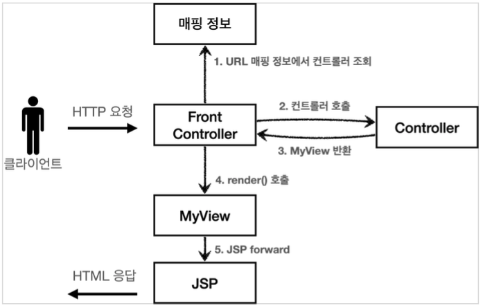 컨트롤러의 process() 메서드의 반환타입이 MyView이므로 프론트 컨트롤러는 컨트롤러의 호출결과로 MyView 객체를 반환받는다. 그리고 MyView의 render() 메서드를 호출하면 forward 로직을 수행해서 JSP가 실행된다.