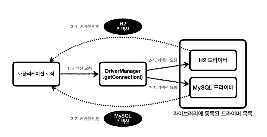 DriverManager.getConnection(..) : 라이브러리에 있는 데이터베이스 드라이버를 찾아 해당 드라이버가 제공하는 커넥션 구현체를 반환.