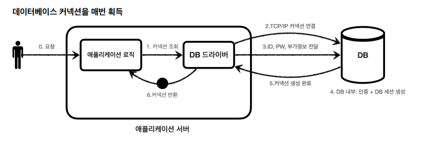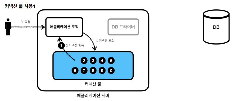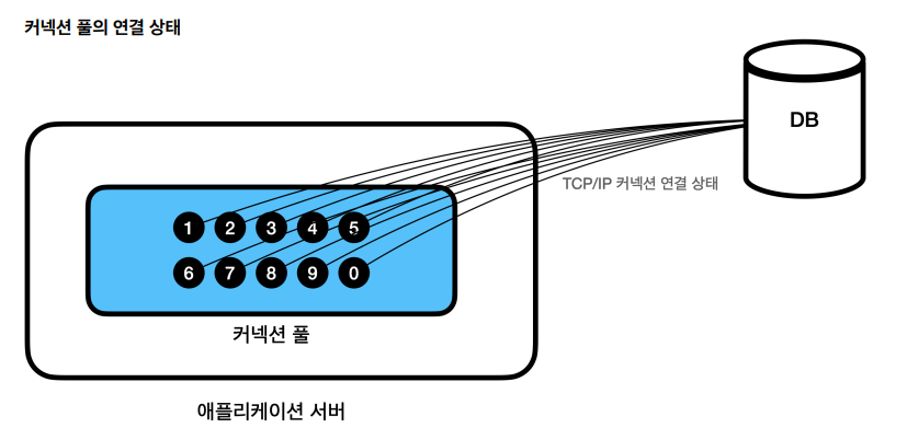 - 애플리케이션 로직에서는 DB 드라이버를 통해 새로운 커넥션을 획득하는 것이 아니라 이미 생성된 커넥션을 커넥션 풀로부터 반환받아 사용