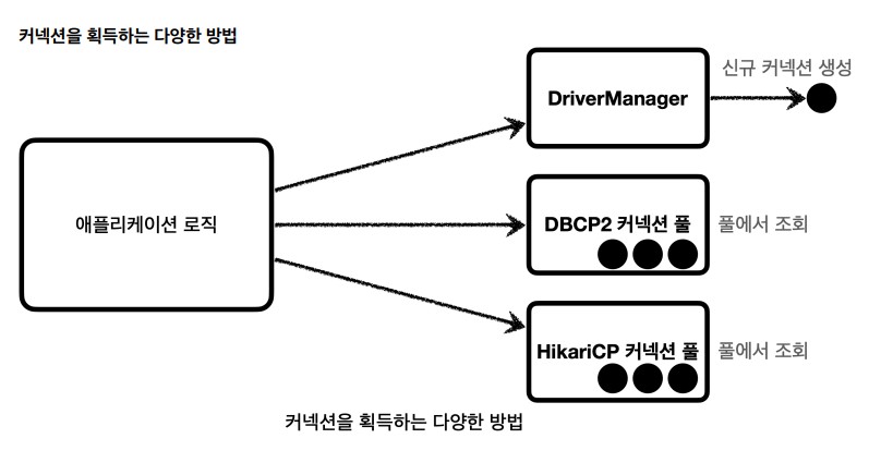 DriverManager또는 커넥션 풀을 통해 획득- 커넥션 획득 방법을 변경해야 할 때 애플리케이션 로직도 수정해야 함