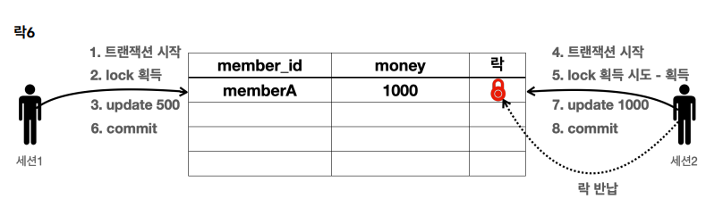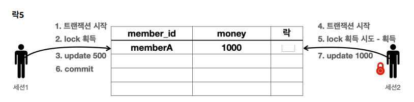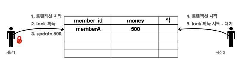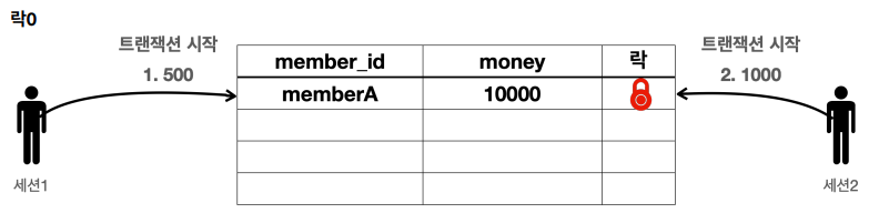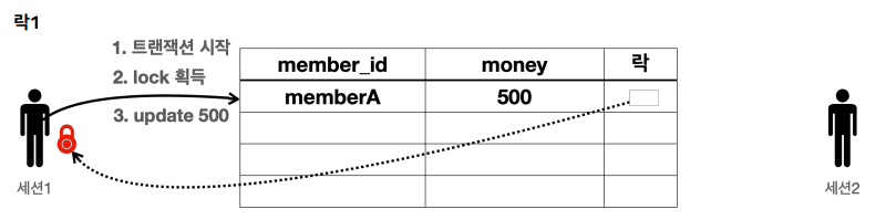- 세션 1, 2 모두 memberA의 금액을 변경하려는 상황