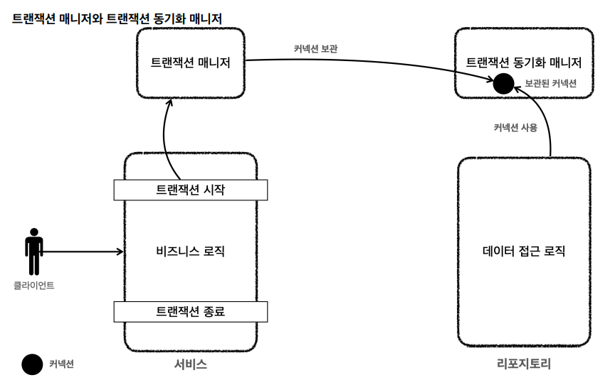 - 트랜잭션 매니저는 트랜잭션이 시작된 커넥션을 트랜잭션 동기화 매니저에 보관