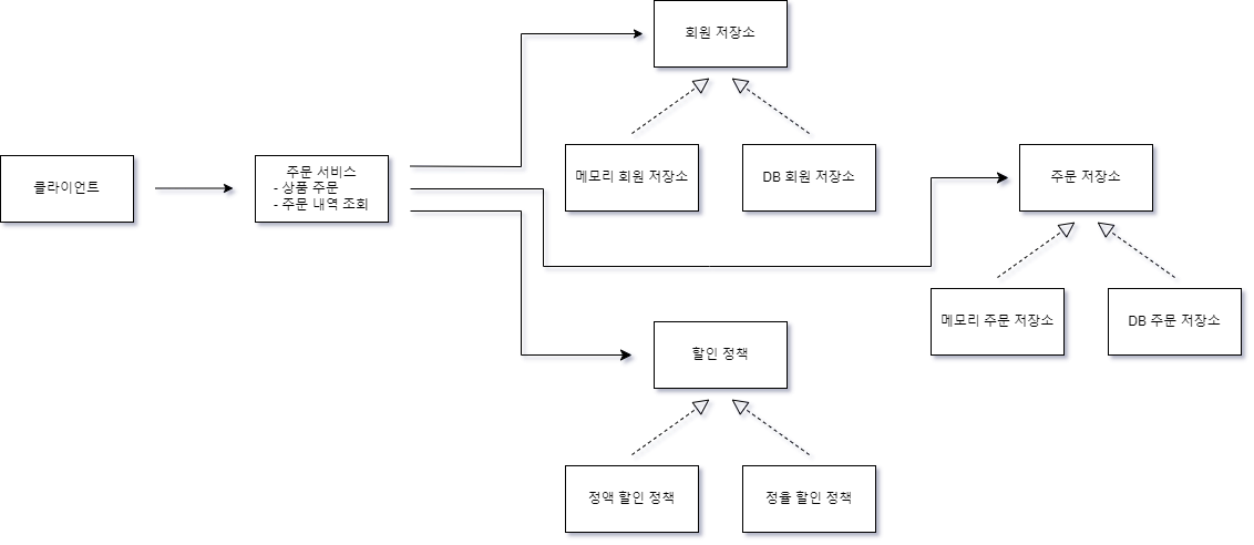 클라이언트가 주문 생성을 요청하여 createOrder 메서드가 호출되면 memberRepository를 통해 회원 정보를 조회하고, discountPolicy로 할인 정책을 적용한다. 만약 정률 할인 정책(RateDiscountPolicy)으로 변경된다 해도 createOrder 메서드의 코드는 수정할 필요가 없다. 참조변수 discountPolicy는 인터페이스 타입이기 때문이다. memberRepository와 orderRepository도 마찬가지로 구현체가 변경되어도 메서드 내의 코드는 수정할 필요가 없다.