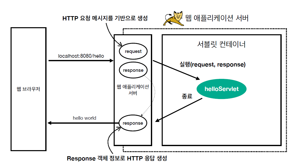 - 웹 서버가 클라이언트의 요청을 받고, 서블릿이 필요한 요청이면 요청을 서블릿 컨테이너에 위임한다.